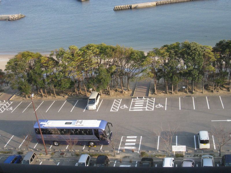 我々が宿泊したのは8階。 そこから愛車ステッピ〜を見るとこんな感じ。ちっちぇぇ〜。 整備された砂浜や小島もキレイですな。 | |