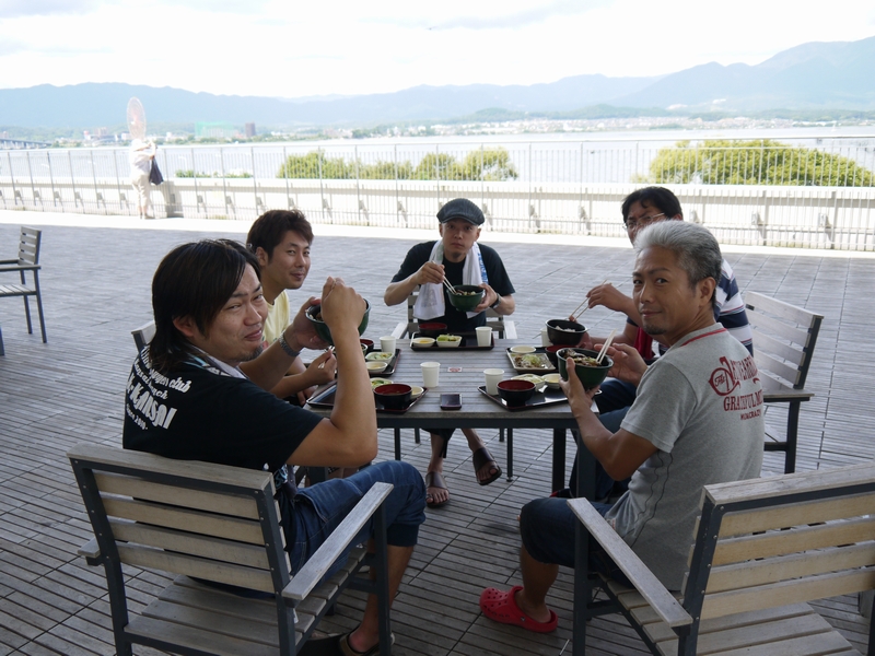 メンバーの皆さんは店内ではなく、琵琶湖の空気を感じられるテラスで食事してました。